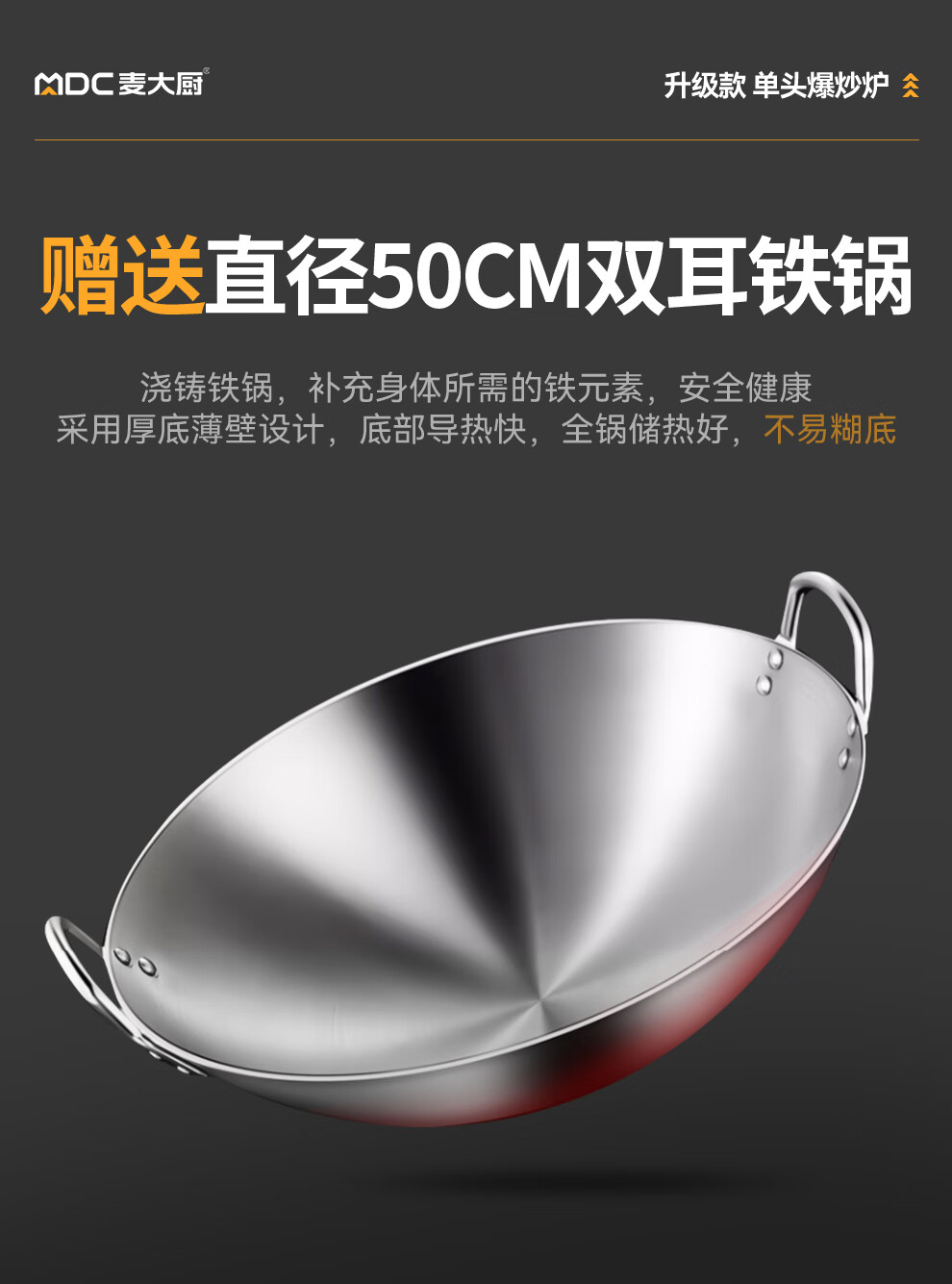 麥大廚升級款材質雙頭單尾小炒爐商用15KW